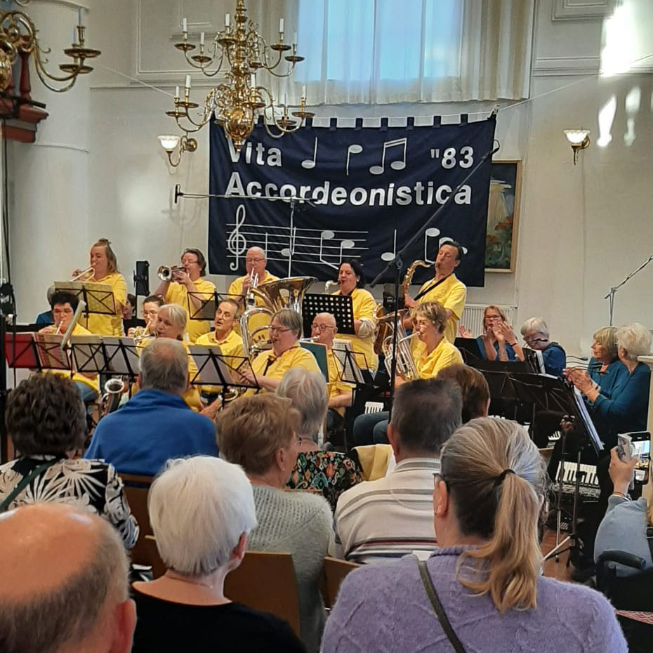 10 mei ’25 hebben we een gezamenlijk concert met accordionorkest Vita Accordionistica gedaan. Het was een spetterend concert. Met behulp van liedteksten hebben we met alle aanwezigen lekker gezongen. Heel bijzonder! Normaal zitten we en lopen de mensen langs en zien de mensen ons maar kort. Nu twee keer 15 minuten gezelligheid. We willen Accordionistica bedanken voor de kans die we hebben gekregen om ons eens op een andere manier te laten horen!